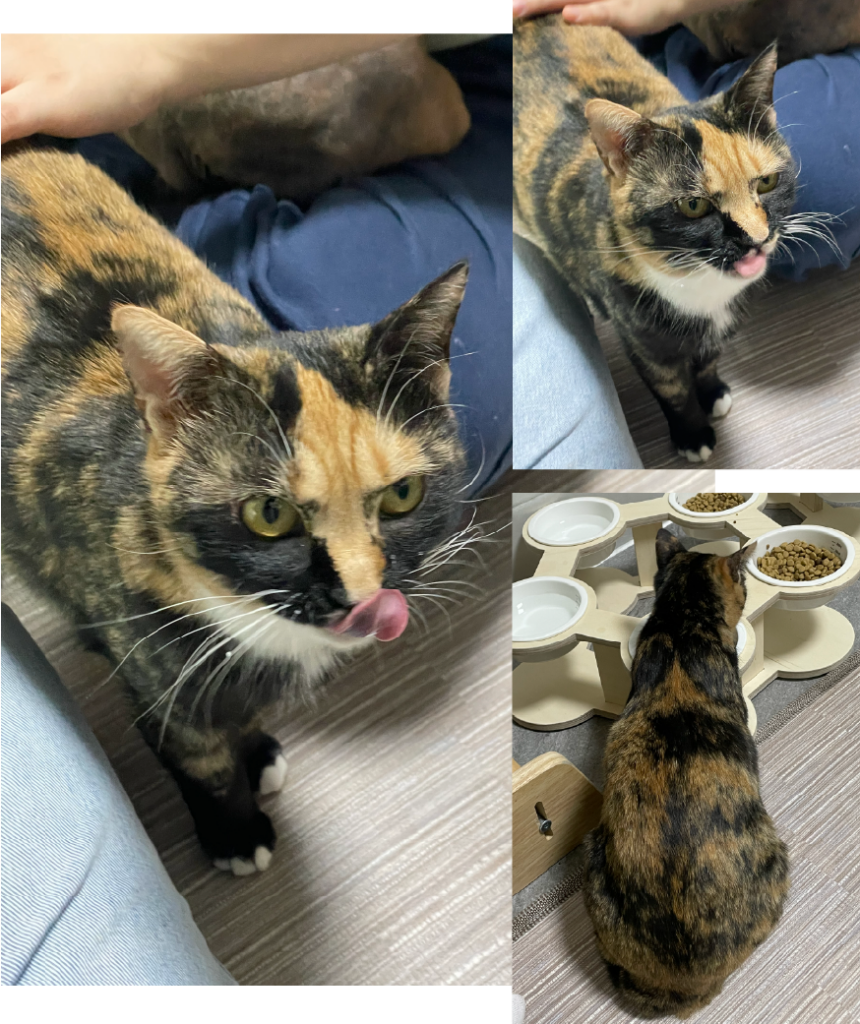 손을 내밀면 머리를 비비며 다정하게 교감을 표현합니다. 다른 동물들과도 잘 지내는 우호적인 성격으로 합사에 큰 어려움이 없습니다. 눈을 감으면 괴도 마스크를 쓴 듯한 특별한 외모 포인트! 카우와 말랑이라는 두 아아의 엄마이기도 합니다.