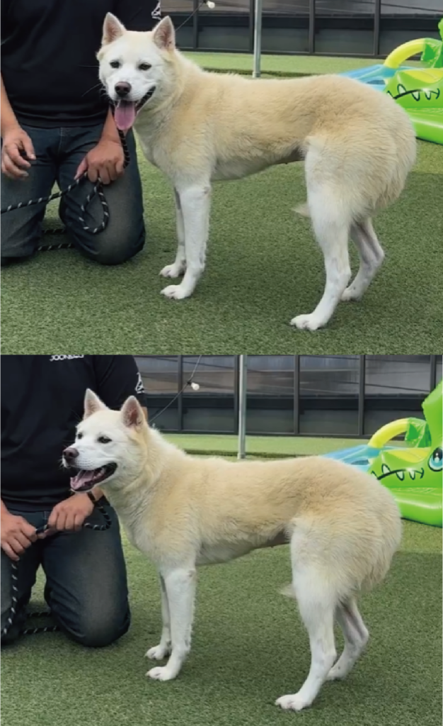 과거 오랜 시간 묶여 지내왔던 점토는처음엔 산책이 많이 서툴렀어요.하지만 준독 소장님의 도움으로산책 교육을 하나씩 차근차근 배우는 중이에요 🐾