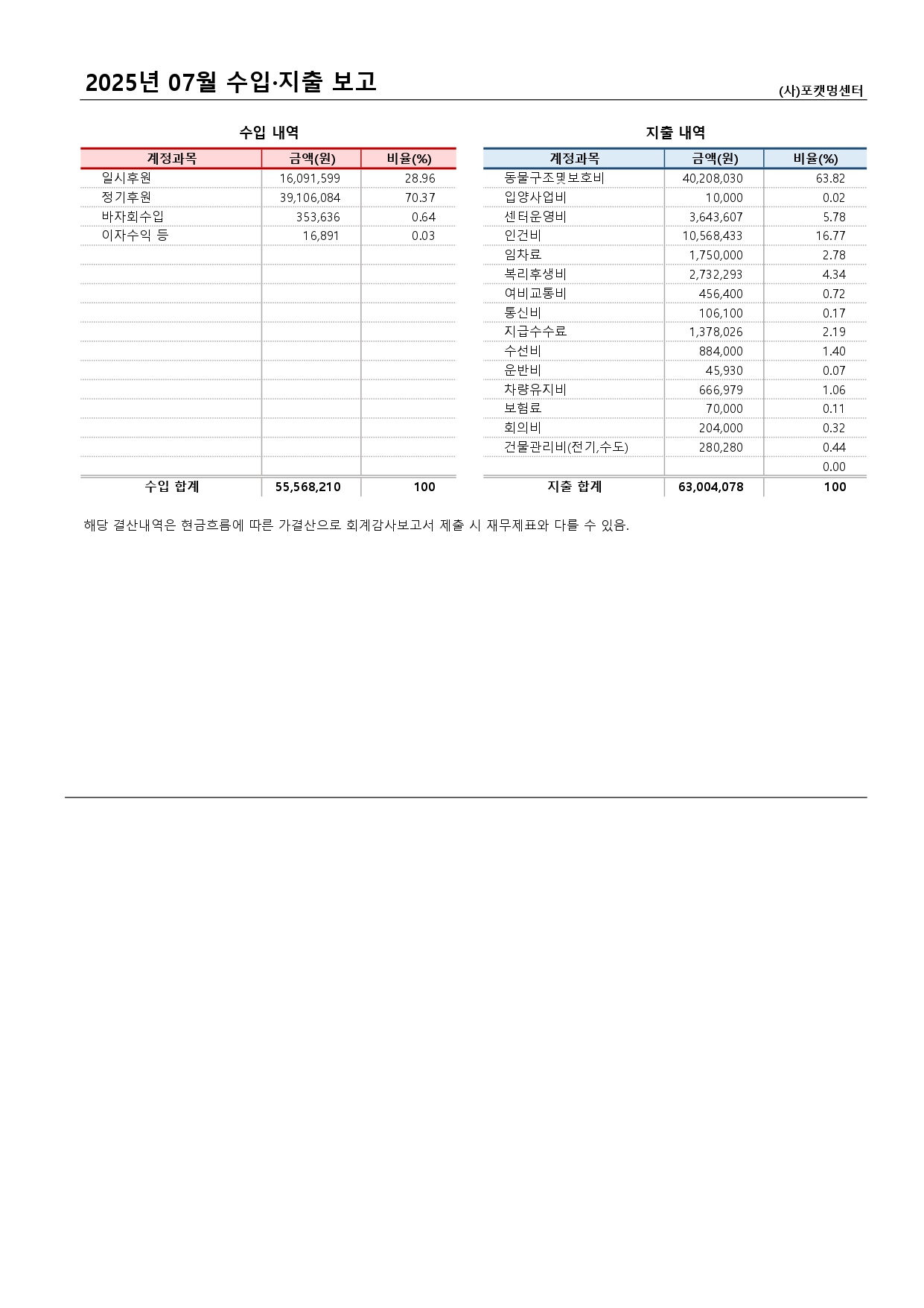 2025년 7월 사단법인 포캣멍센터 후원 및 지출 내역